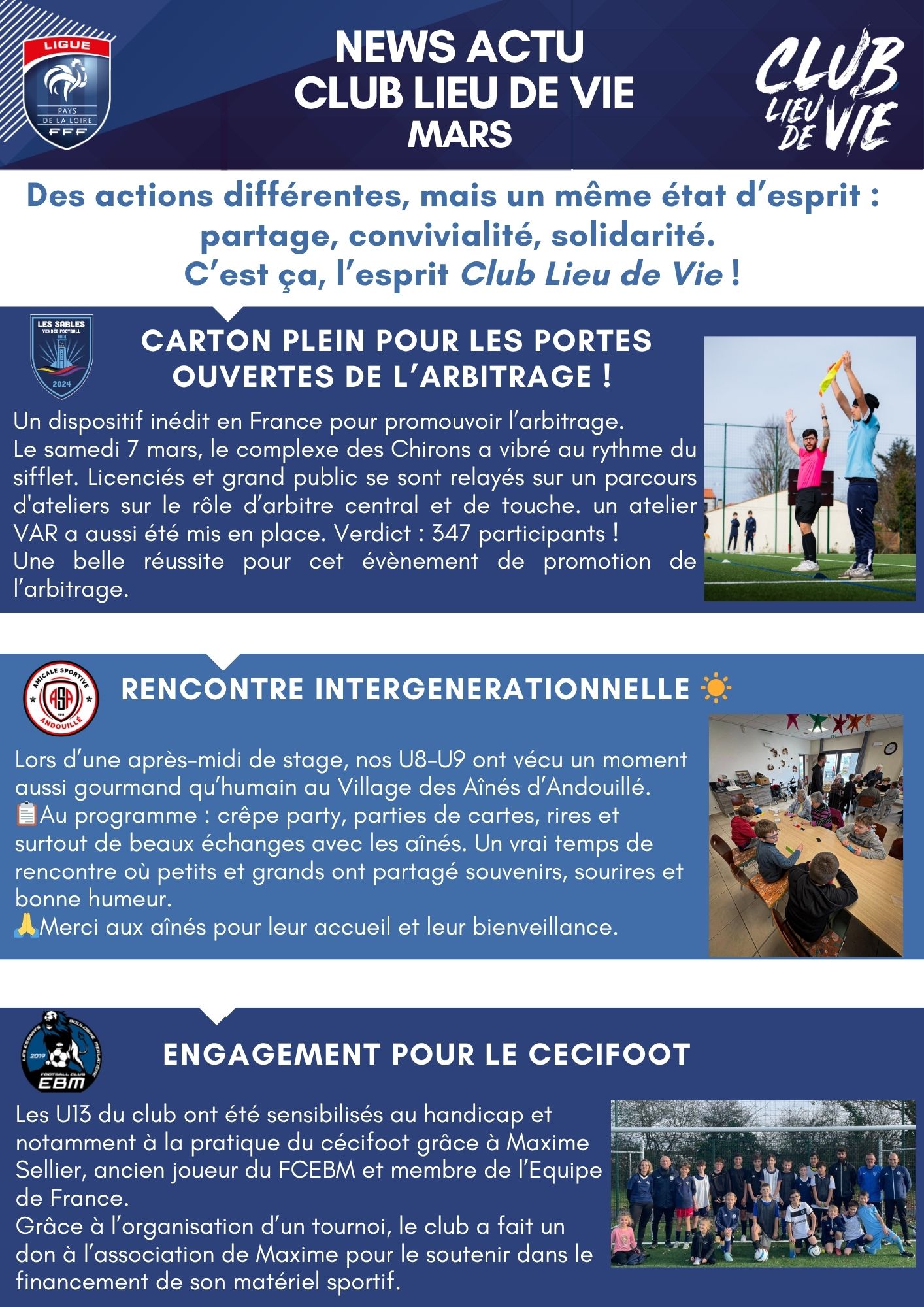 Dans la News Actu Club Lieu de Vie du mois de mars 2026, retrouvez quelques exemples d’actions déposées sur la plateforme dédiée aux Clubs Lieu de Vie. Toujours de belles initiatives, avec ce mois-ci Les Sables Vendée Football, l’AS Andouillé et le FC Essarts Boulogne Merlatière.