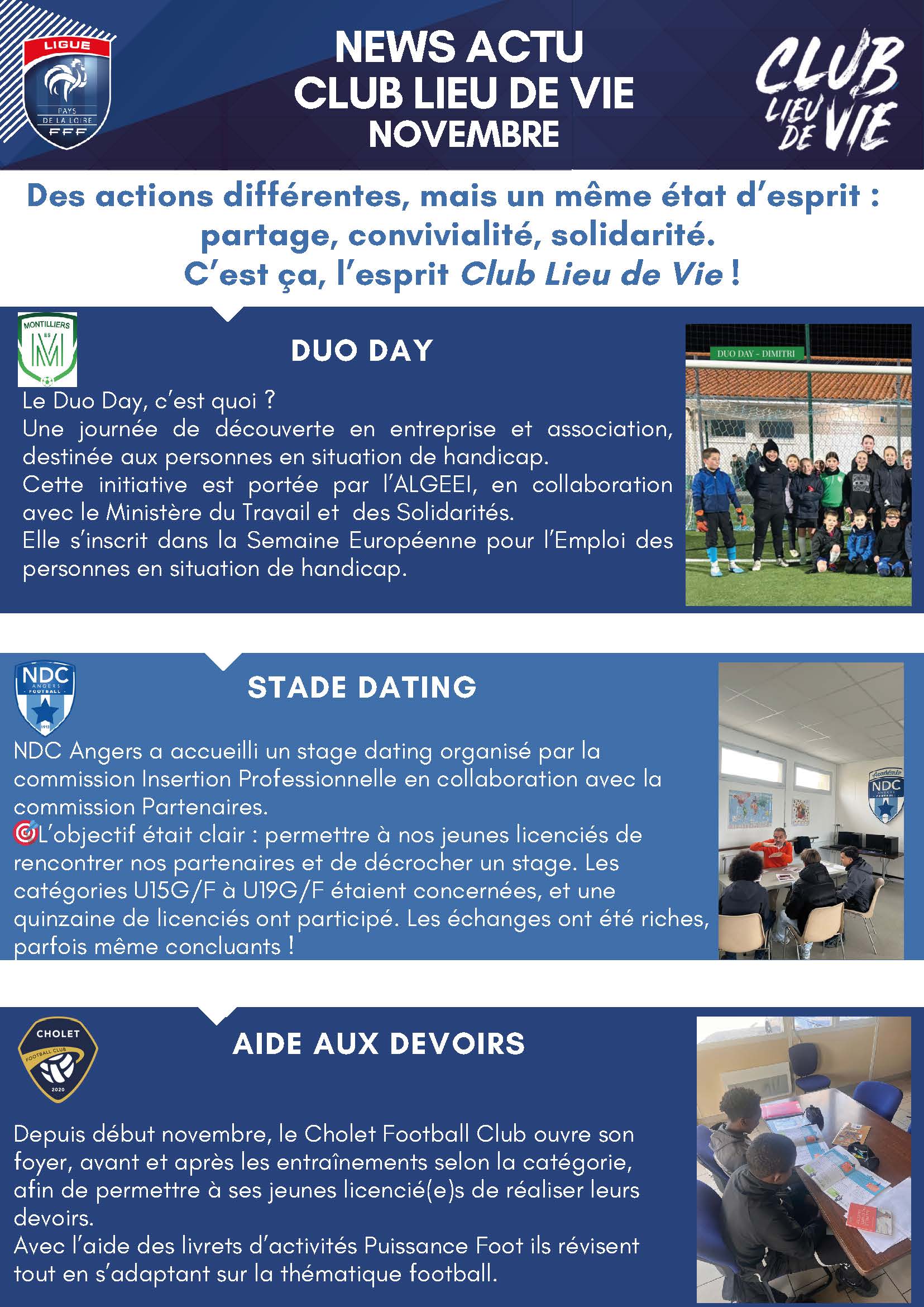 Dans la News Actu Club Lieu de Vie du mois de novembre, retrouvez quelques exemples d’actions déposées sur la plateforme dédiée aux Clubs Lieu de Vie, avec l’ES Montilliers, Angers NDC et Cholet FC.