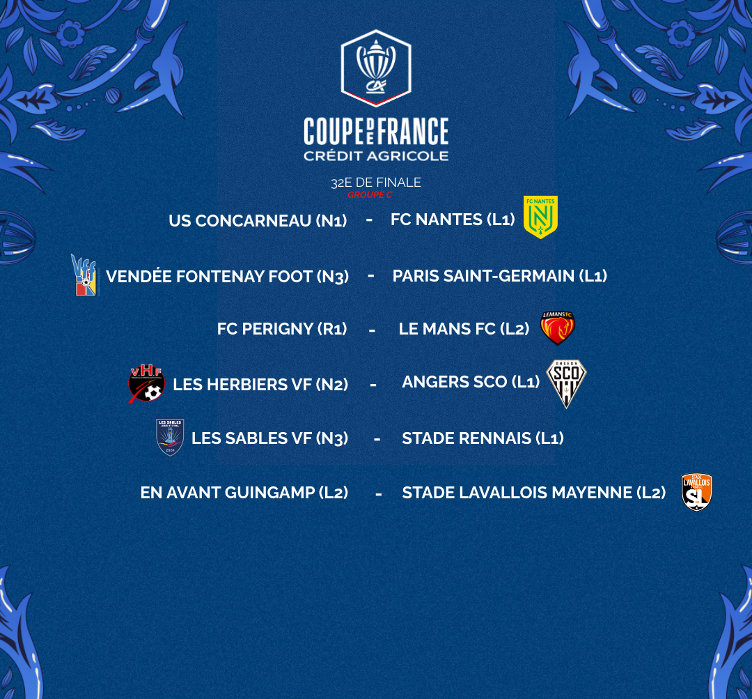 ⚽️ Le FC Nantes entrera en lice à Concarneau (N1), 2 clubs chers à Didier Deschamps, alors que le Stade Lavallois Mayenne Football Club poursuivra sa route à Guingamp, autre équipe de L2, vainqueur de l’Ancienne Château-Gontier au tour précédent. Nouvelle équipe de Régional pour Le Mans FC qui se déplacera à Périgny (R1), tombeur de Beaucouzé ce week-end. Bref, un tirage exceptionnel pour nos clubs !