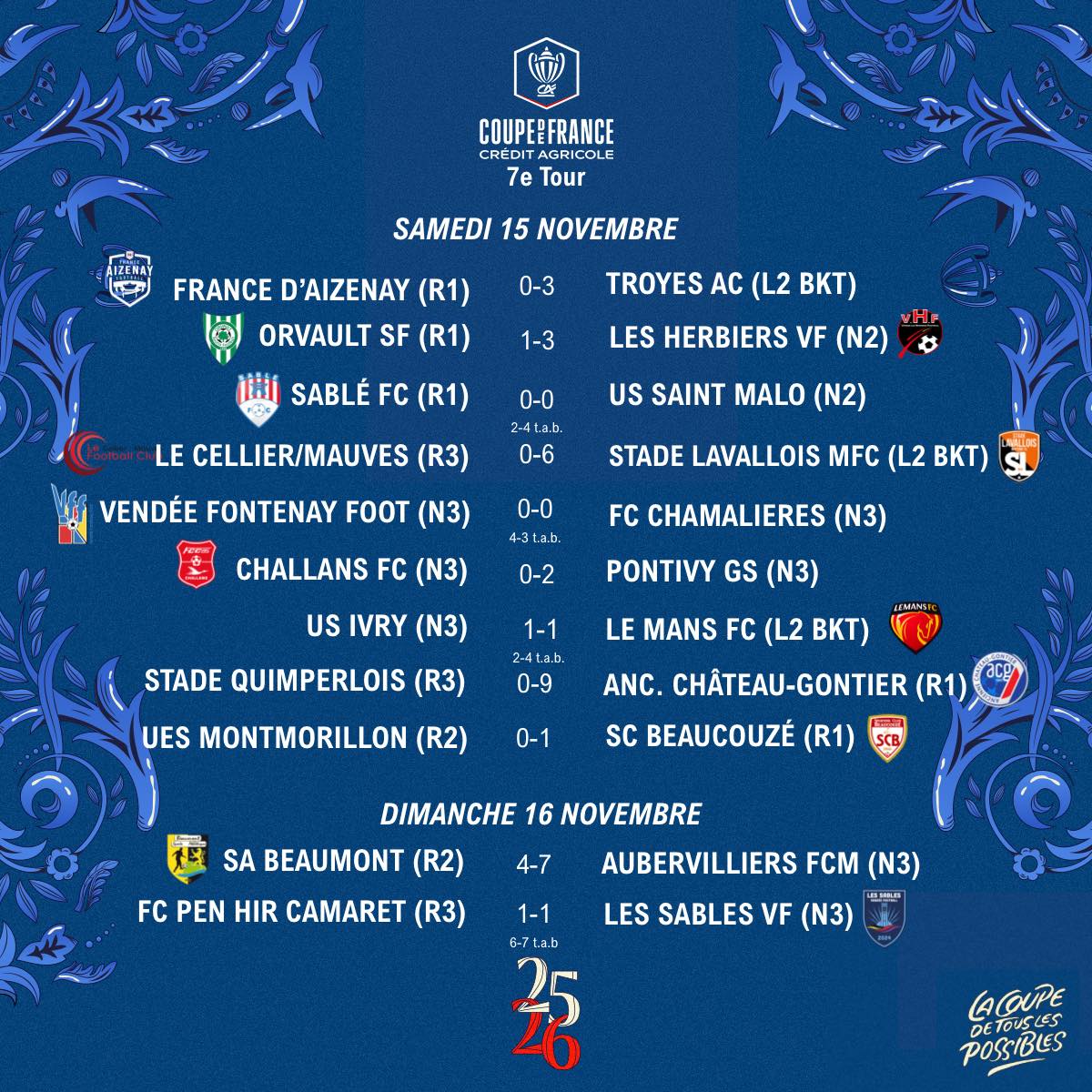 Un grand bravo aux qualifiés jusqu’à ce 1er tour fédéral : on pense notamment et évidemment à notre petit poucet, le FC Cellier-Mauves, éliminé avec les honneurs dans une magnifique ambiance à Ancenis. Mais aussi aux joueurs d’Aizenay tombés avec les honneurs face à l’actuel leader de L2 BKT, Troyes. Ou encore à Beaumont sur Sarthe (R2), héroïque lors de l’un des matchs-phares de ce 7e tour face à Aubervilliers (4-7) !