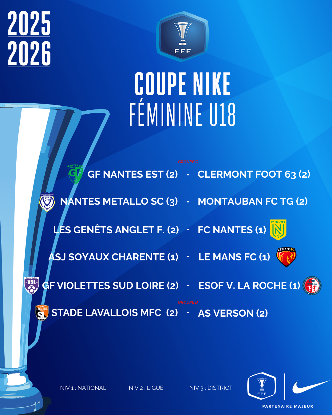 Pour le 1er tour fédéral (32e de finale), nos 3 formations de niveau national entreront en lice : le FC Nantes, Le Mans FC et l’ESOF La Roche Vendée. Les nantaises et les mancelles se déplaceront respectivement chez les Genêts d’Anglet (niveau 2) et à l’ASJ Soyaux Charente (niveau 1).