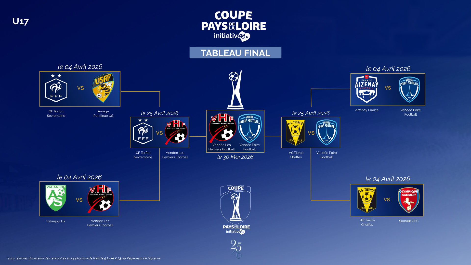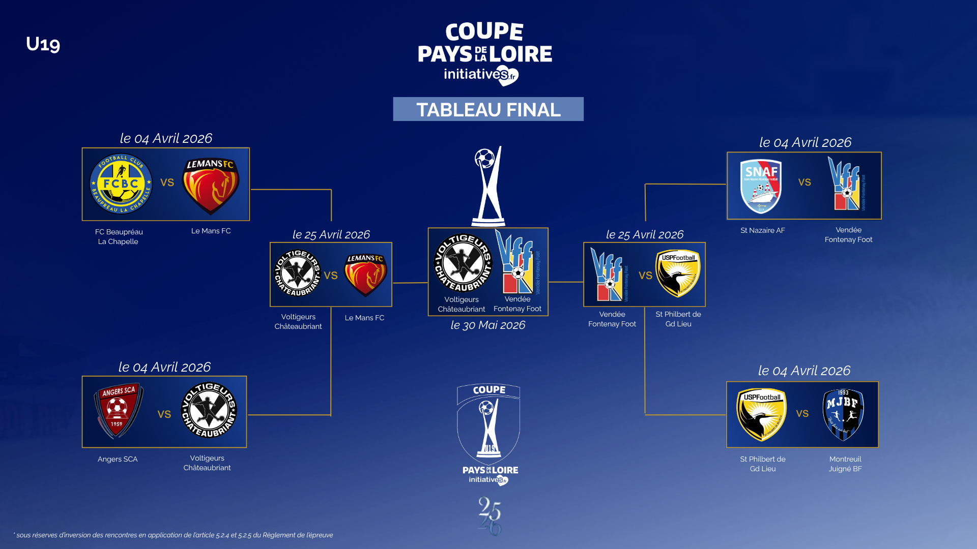 Les demi-finales des Coupes Initiatives U17 et U19 ont rendu leur verdict ce week-end, et les affiches des finales régionales, prévues le 30 mai prochain aux Herbiers, sont désormais connues.
