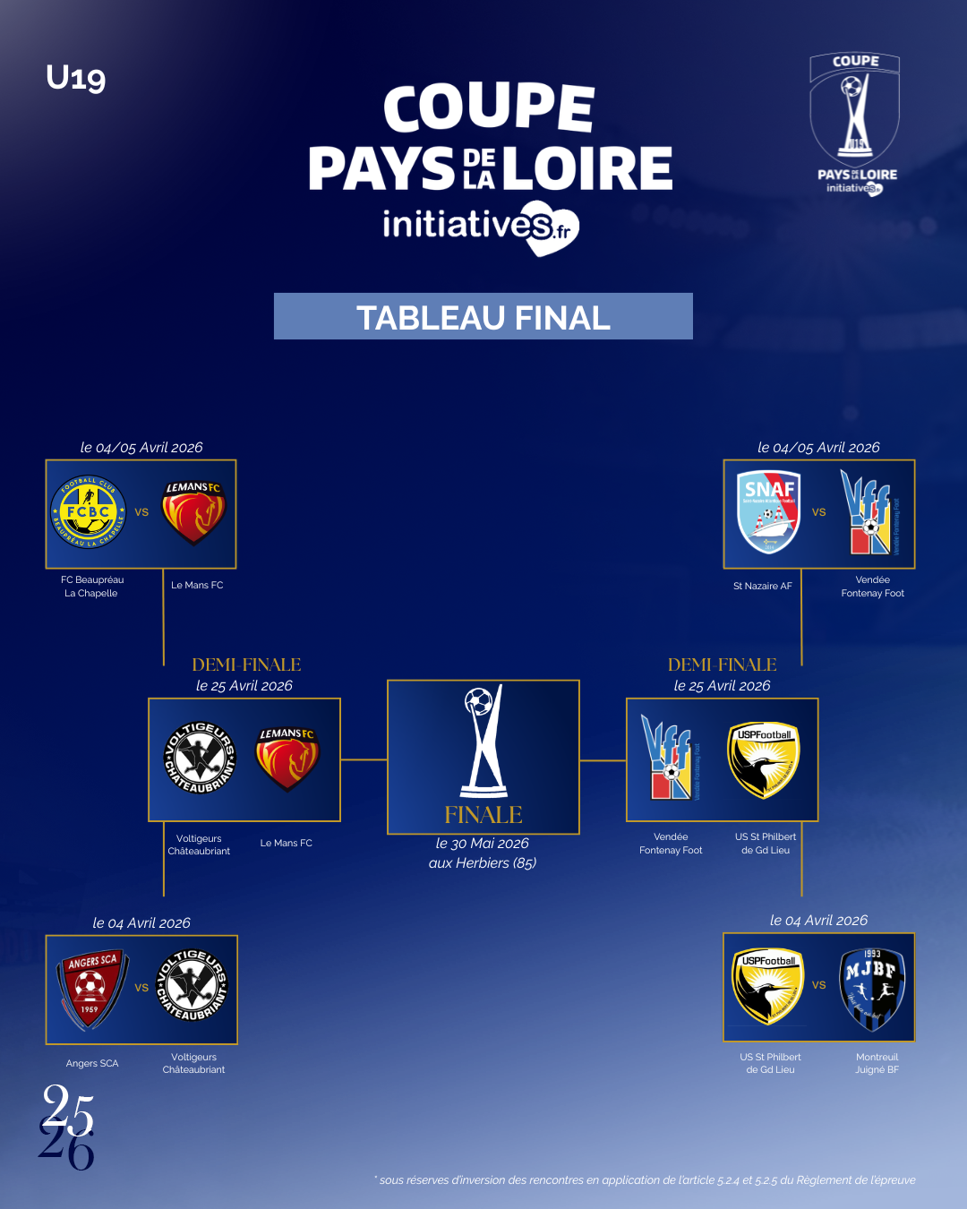 Les demi-finales des Coupes des Pays de la Loire U17 et U19 Initiatives sont programmées le samedi 25 avril 2026.