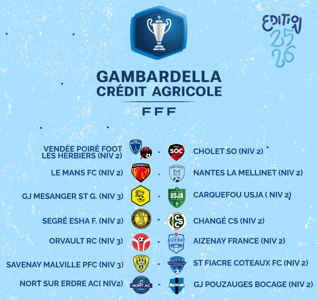 Un tirage de Gambardella qui a désigné d’entrée de jeu Le Poiré ou Les Herbiers qui se rencontreront ce week-end en match en retard du 5e tour. Les vainqueurs de ce match recevront ensuite le SO Cholet, d’ores et déjà l’une des belles affiches du 6e tour (week-end du 22-23/11). Trois autres matchs opposeront des équipes de niveau régional : Le Mans FC/Nantes La Mellinet ; ESHA Segré/CS Changé et AC Nort sur Erdre/GJ Pouzauges Bocage. Les formations de District évolueront toutes à domicile avec notamment à venir deux derbys de Loire-Atlantique : le GJ Mésanger-Saint-Géréon recevra l’USJA Carquefou, alors que Savenay-Malville PFC accueillera le FC Saint-Fiacre Coteaux. Enfin, Orvault RC (niveau 3 – District) tentera un nouvel exploit face à La France d’Aizenay (niveau 2 – Ligue) après avoir écarté Montreuil-Juigné-Béné au tour précédent (lire notre article).