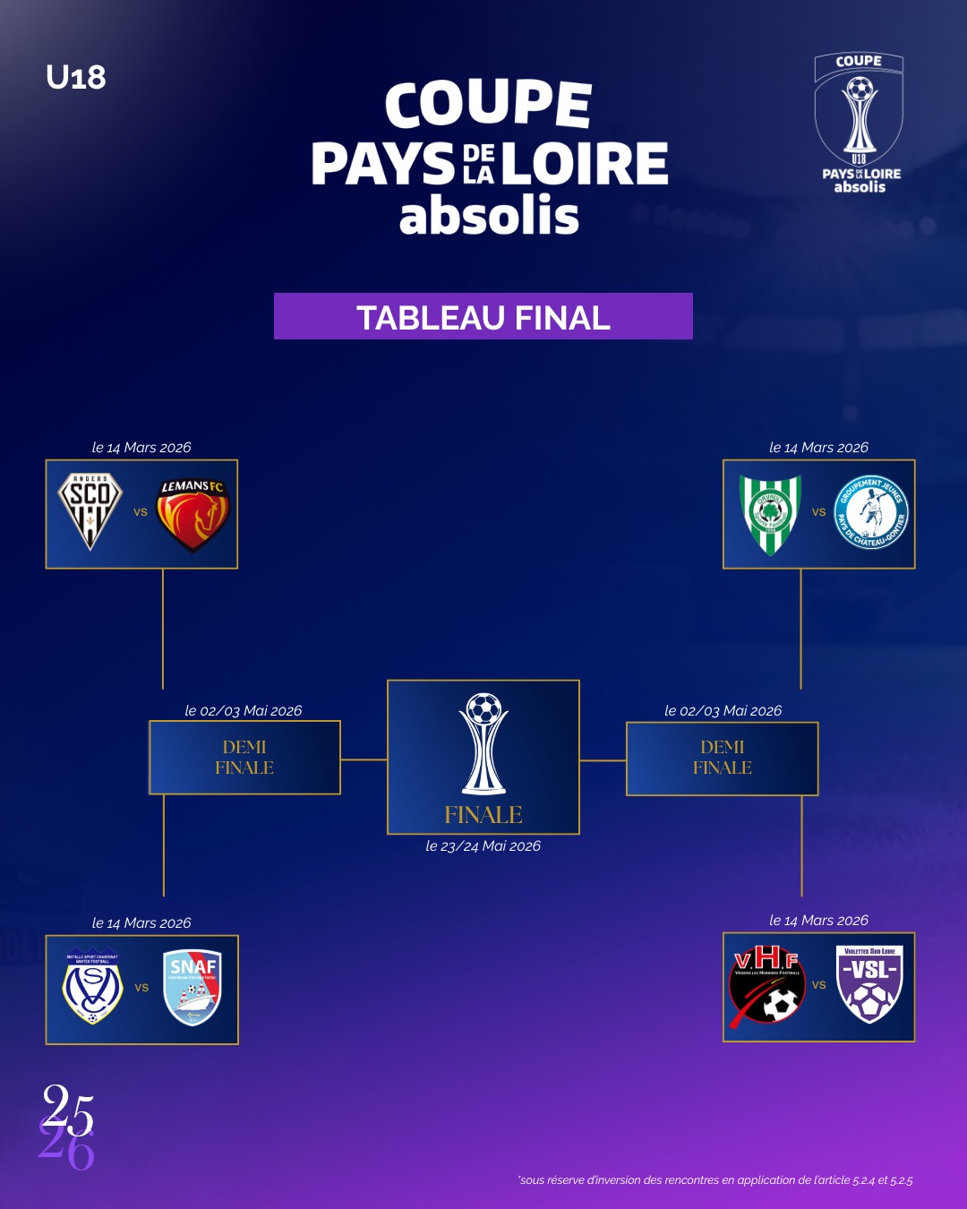 Un tirage qui a débuté par une affiche : la réception d’Angers SCO, actuel leader de la R1, par la réserve du Mans FC, tenant du titre. Dans la même partie de tableau, les U18F des Métallos de Chantenay, seule équipe de District encore en lice, accueilleront les joueuses du Saint-Nazaire AF (R2). Dans l’autre partie de tableau, le GJ Pays de Château-Gontier (R2) accueillera une formation de l’élite régionale, Orvault Sports, alors qu’un duel de R2F opposera Les Herbiers VF aux Violettes du Sud-Loire ! Rendez-vous à la mi-mars pour ces quarts de finale !