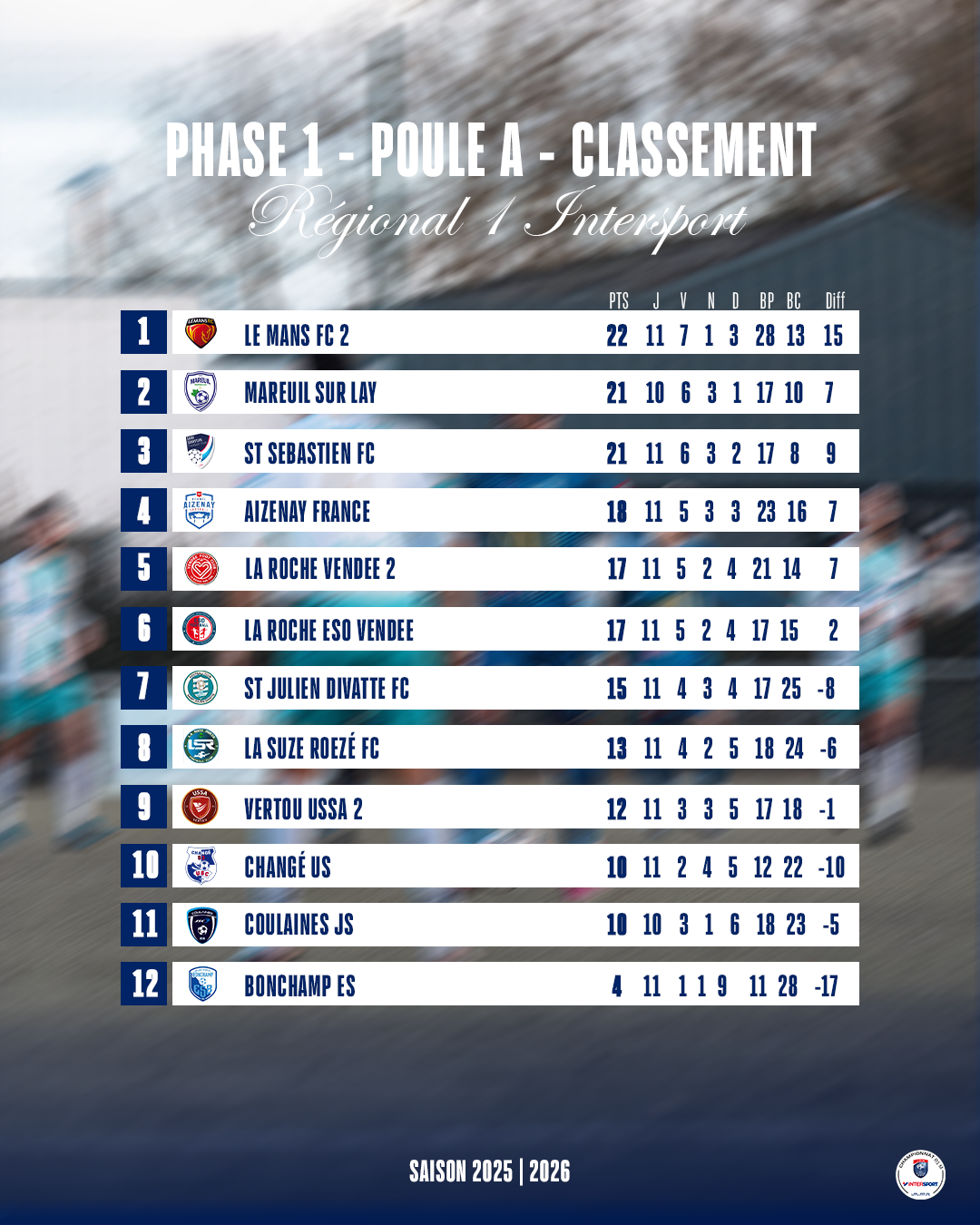 Suivent ensuite Aizenay France (18 points), La Roche Vendée 2 (17 points) et La Roche ESO Vendée (17 points), qui composent un solide milieu de tableau et restent en course pour les premières places.