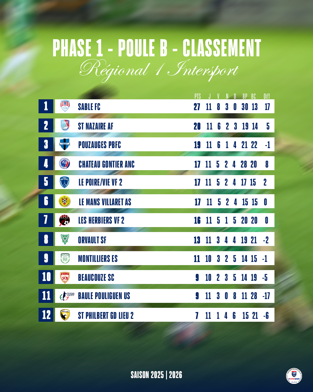 Dans le groupe B, Sablé FC domine largement avec 27 points. Derrière, Saint-Nazaire AF (20 points) et Pouzauges PBFC (19 points) forment le trio de tête, tandis que Château-Gontier Ancienne (17 points), Le Poiré-sur-Vie VF 2 (17 points) et Les Herbiers VF 2 (16 points) se tiennent dans un mouchoir au milieu du classement.