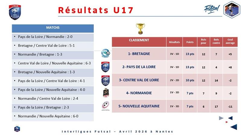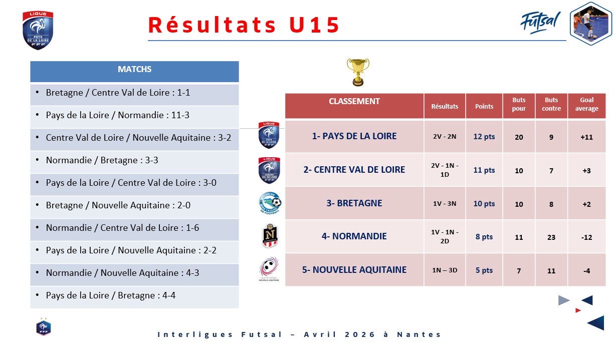 La Ligue des Pays de la Loire avait le plaisir d’accueillir et d’organiser la semaine dernière les InterLigues U15 et U17 Futsal au CREPS des Pays de la Loire, marqués par la participation des sélections des Ligues de Bretagne, du Centre-Val de Loire, de Normandie et de Nouvelle Aquitaine.