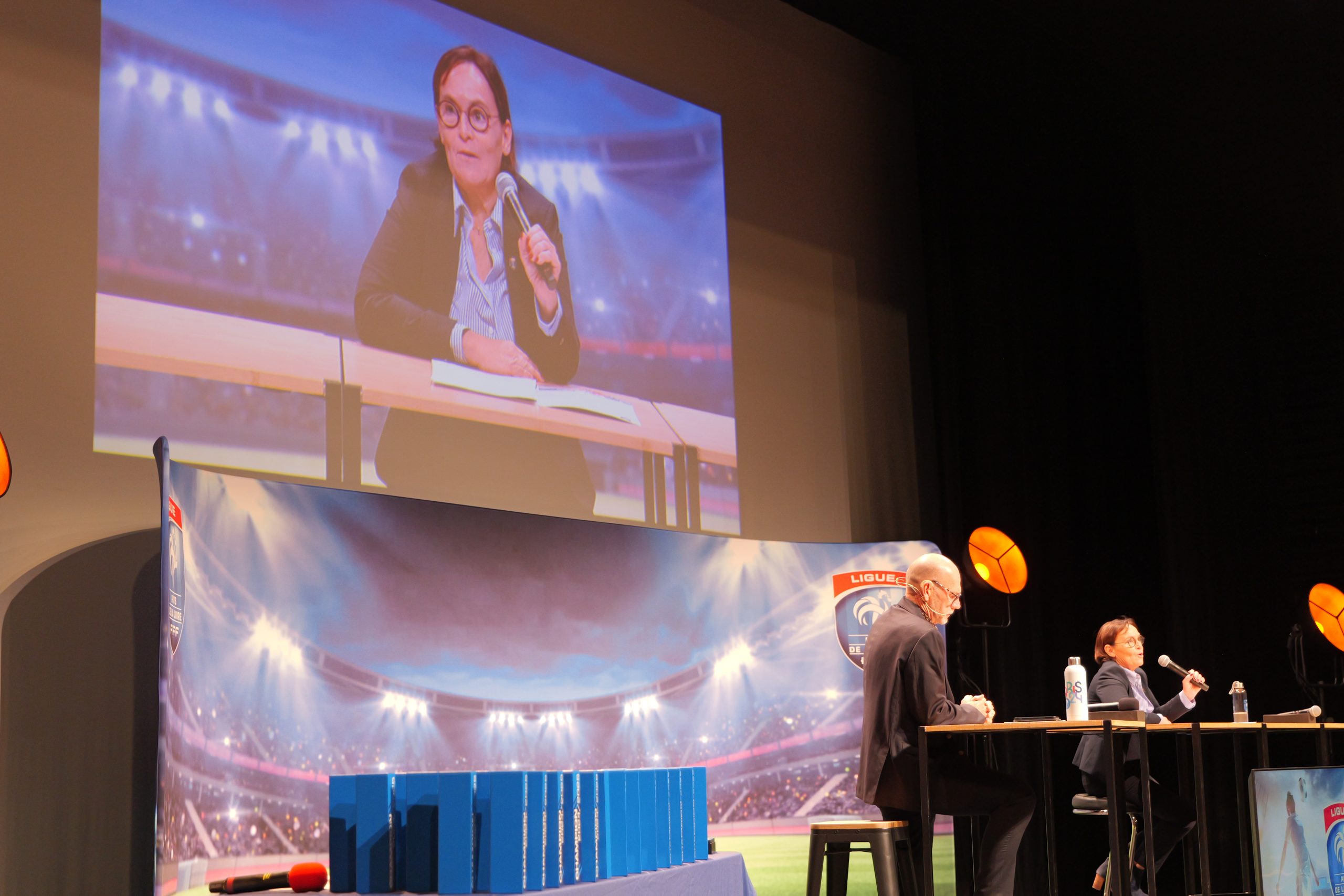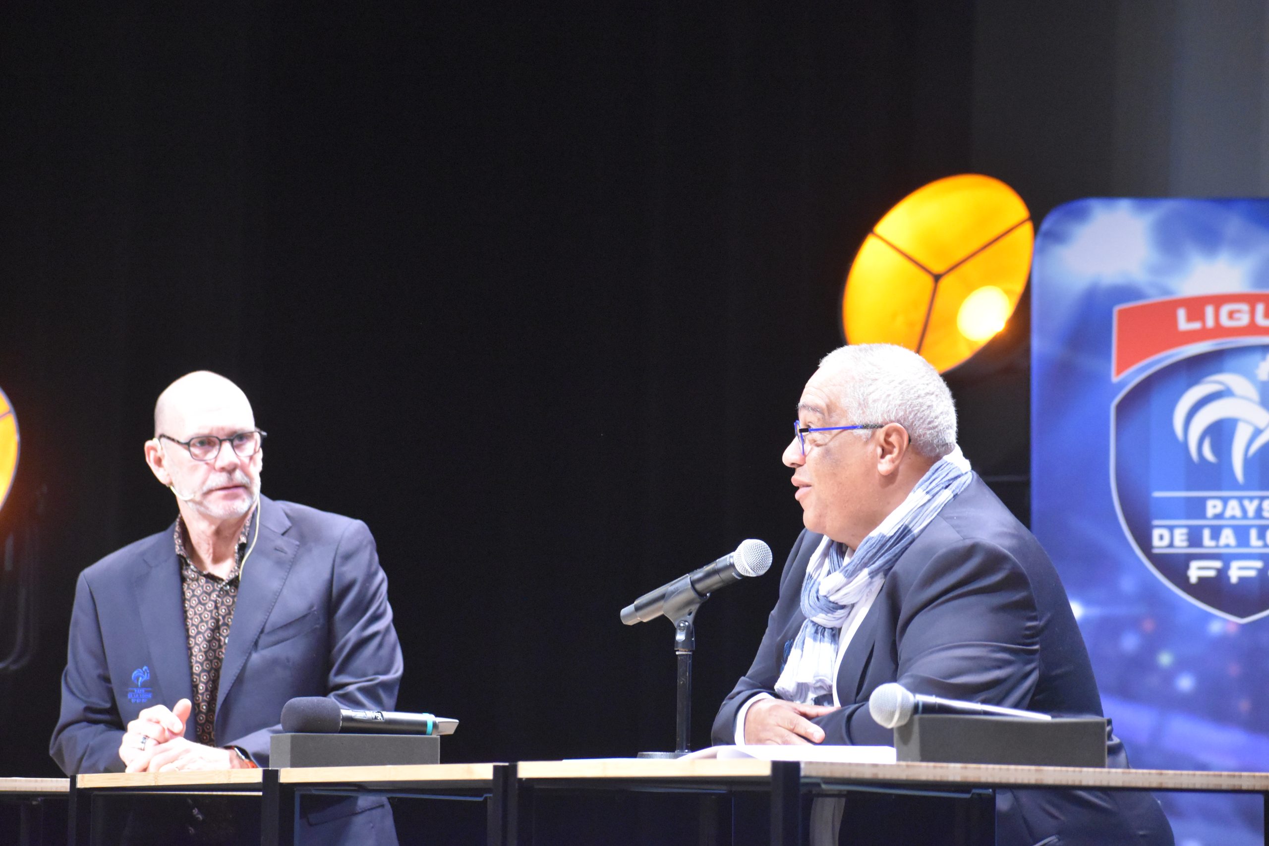 C’est en effet un trio d’acteurs qui a lancé cette AG, dans des rôles de composition (arbitre, éducateur, parent), avant que Didier Esor, Président de la Ligue, n’interrompe la scène en lançant Laurence Charneau, membre du Bureau, pour présenter « la stratégie de l’Engagement de la Ligue ». La responsable du Pôle insistait sur le fait que « 95 % de nos rencontres incarnent le fair-play » et sur l’objectif de mieux appréhender les « 5 % de matchs qui dérapent » ou avec un ressenti négatif. « Notre volonté est de placer le climat des rencontres au coeur de nos projets communs Ligue-Districts, ajoutait Didier Esor lors de son discours principal (photo ci-dessous aux côtés de notre directeur général Jérôme Clément). Le centre de tout « projet-club » doit être l’école de football ».