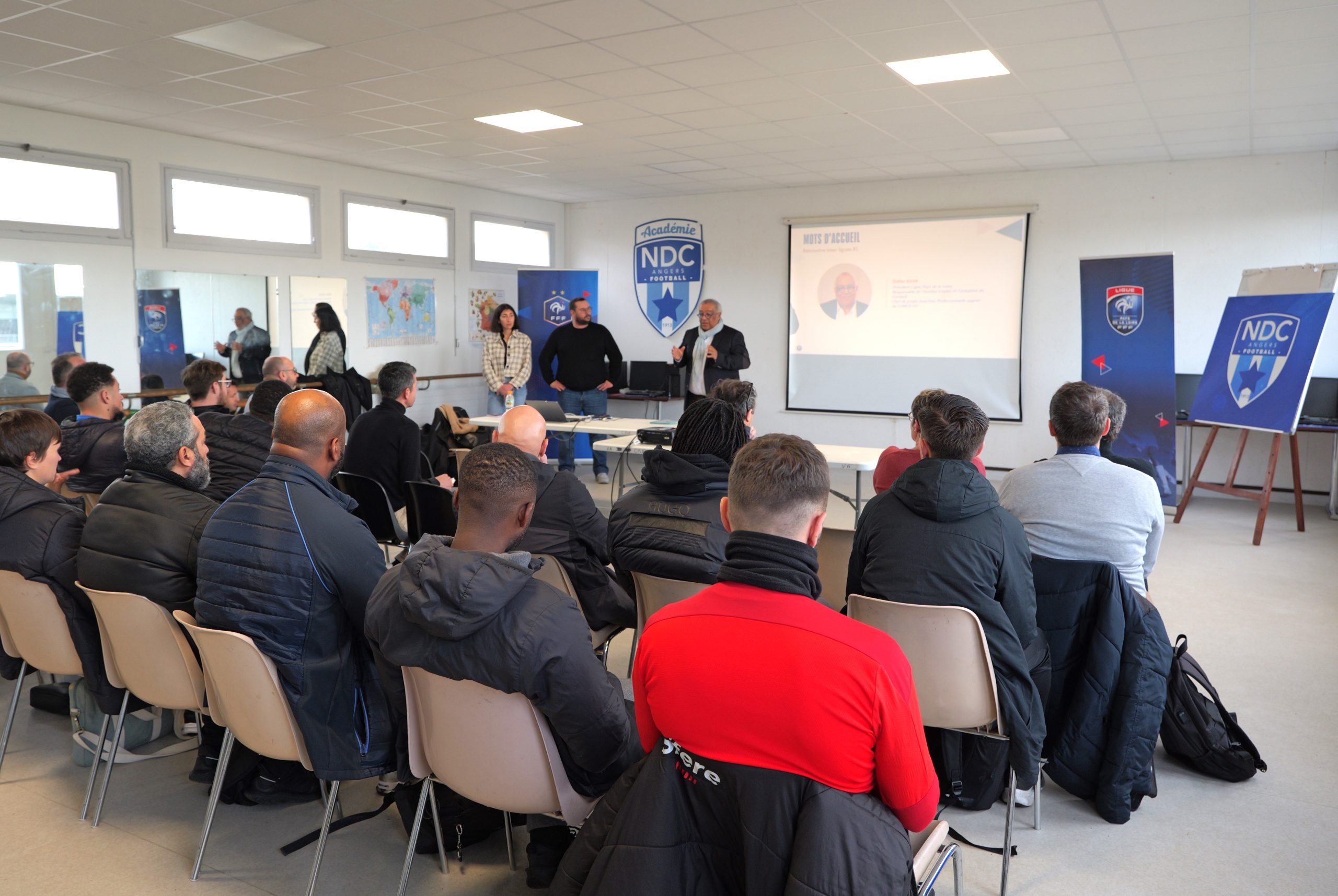 A la fois Président de la Ligue et Responsable de l’Institut Emploi Formation du Football (IEFF), Didier Esor a lancé cette première réunion Interligues en remerciant le club d’Angers NDC pour son accueil avant de souligner « la richesse de notre football grâce à votre accompagnement des jeunes dans les quartiers », puis de laisser Matthieu Robert et Marine Ecobichon (FFF) présenter les enjeux de la journée. Tour à tour, les éducateurs socio-sportifs de la quinzaine de clubs représentés ont alors présenté leurs différents actions, allant de l’emploi à l’insertion professionnelle en passant par la féminisation, la question des réfugiés ou encore celle des violences sexistes et sexuelles (VSS). Des débats d’une grande richesse confortés par les propos d’Anne Guillerm et Samuel Dumont, représentants de la DRAJES Pays de la Loire et du SDJES 49, puis ceux d’Arnaud Gandais, représentant la Direction Générale de France Travail et Sylvain Landa (Think Tank Sport et Citoyenneté). Après une session « découverte » de Football en Marchant en début d’après-midi, orchestrée par l’équipe d’Angers NDC, la journée s’est conclue par la question de la pérennisation de ces emplois d’éducateurs socio-sportifs, via la présentation de Luc Hernu (IEFF) et le responsable du Service aux Clubs LFPL, Laurent Ydier, et par les outils offerts aux clubs présentés par Matthieu Robert et Marine Ecobichon.